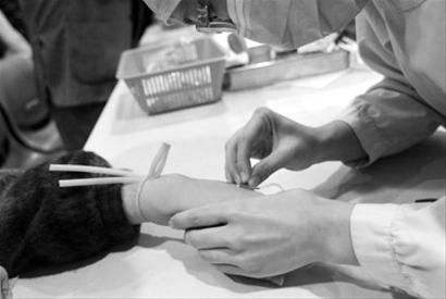 血管较深,可适当增加进针角度,见回血后,同样要依血管走向平行进针。对于进针长度可视血管好坏而定,通常进二分之一到三分之二即可。 对于扎过止血带如若血管不易暴露者,本人不喜欢用手拍。拍手背不仅病人疼痛而且手背若拍红了血管也不一定暴露,可适度轻揉,至血管凸起。不乏例外,临床上曾碰到一例止血带扎过以后血管凸起,轻揉后,便什么都看不见了,只好重扎止血带,所以临床上还是需要随机应变。 如果手背血管不清,可另选手指,手腕或手臂等地方进行注射或输液。手指以大拇指血管和食指或者中指血管较易找,少数病人无名指和小指血管易找,视情况而定,但手指扎针不易绷紧皮肤和固定针柄,且病人较疼痛,故一般不可取。 对于手臂注射及输液,有的血管较凸起并暴露,有的反之。这就需要靠自己感觉,进针角度视血管深浅适度改变,可能角度小进针快病人的痛苦会大大减少,但重要一点还是需要摸清血管走向进针,见回血后顺其方向再平行进针。